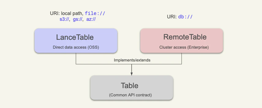 A table is the core data abstraction in LanceDB: a structured dataset with schema, indexes, and versioned updates. What changes between deployments is how that table is addressed and accessed. The mental model below clarifies table types by connection mode:LanceTable: direct table access (local path,file://,s3://, and similar object-store paths). This is the common mode in LanceDB OSS.RemoteTable: catalog-backed table access through a server/cluster (db://...). This is the mode you will use in LanceDB Enterprise.
